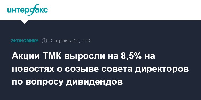 Москва. 13 апреля. INTERFAX.RU - Акции ПАО "Трубная металлургическая компания" (ТМК) выросли в начале торгов на Московской бирже в четверг на 8,5% (до 109,2 рубля за штуку) на новостях о созыве совета директоров компании по вопросу дивидендов.