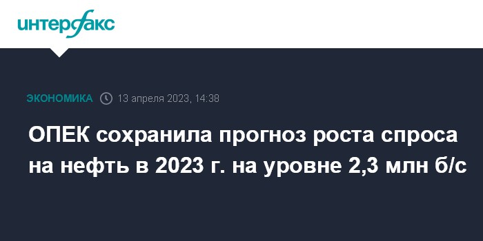 Москва. 13 апреля. INTERFAX.RU - ОПЕК второй месяц подряд не меняет прогноз роста спроса на нефть в 2023 году, ожидая его на уровне 2,3 млн б/с, сообщается в ежемесячном отчете организации.