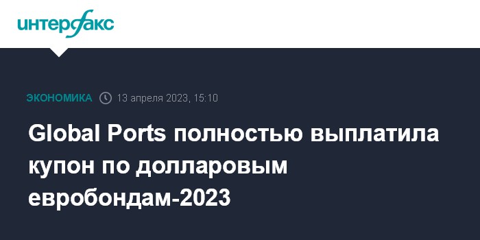 Москва. 13 апреля. INTERFAX.RU - Оператор морских контейнерных терминалов Global Ports полностью выплатил купон по долларовым еврооблигациям-2023, сообщила компания.