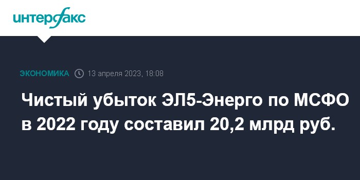 Москва. 13 апреля. INTERFAX.RU - Чистый убыток ПАО "ЭЛ5-Энерго" по МСФО в 2022 г. составил 20,2 млрд руб. против прибыли 2,6 млрд руб. годом ранее, следует из отчета компании.