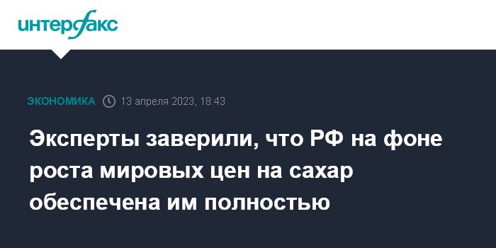 Москва. 13 апреля. INTERFAX.RU - РФ полностью обеспечена сахаром собственного производства, что может защитить внутренний рынок от колебания мировых цен, считают эксперты.