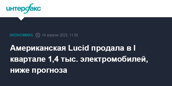 Москва. 14 апреля. INTERFAX.RU - Американская Lucid Group Inc. продала 1 406 люксовых электромобилей Lucid Air в первом квартале, говорится в сообщении компании. Опрошенные FactSet аналитики ожидали продажи около 2 тыс. машин.