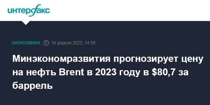 Москва. 14 апреля. INTERFAX.RU - Минэкономразвития прогнозирует цену на нефть марки Brent в 2023 году в $80,7 за баррель, в 2024 году - $75,7, в 2025 году - $71,9, в 2026 году - $70,6.