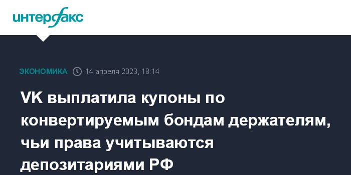 Москва. 14 апреля. INTERFAX.RU - VK выплатила купоны по конвертируемым облигациям инвесторам, права которых учитываются российскими депозитариями, сообщила компания.