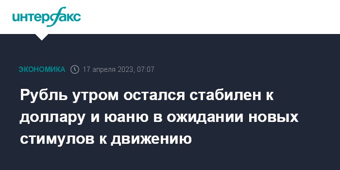 Москва. 17 апреля. INTERFAX.RU - Доллар США и юань стабильны на Московской бирже на старте торгов в понедельник, рубль не меняется в ожидании новых стимулов к движению.