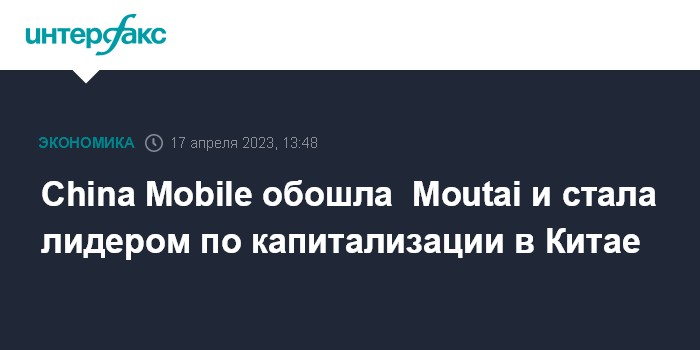 Москва. 17 апреля. INTERFAX.RU - China Mobile стала лидером по капитализации в Китае, обойдя Kweichow Moutai Co., пишет China Daily.
