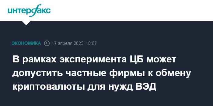 Москва. 17 апреля. INTERFAX.RU - Банк России в рамках работы экспериментального правового режима (ЭПР) не исключает допуск частных компаний на рынок обмена криптовалюты для участников внешнеэкономической деятельности (ВЭД), но на первом этапе это должна быть компания с госучастием, сказал журналистам зампред ЦБ Алексей Гузнов.