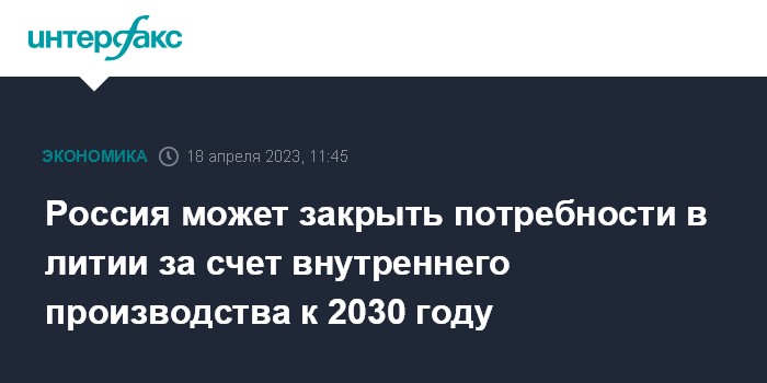 Москва. 18 апреля. INTERFAX.RU - Закрыть потребности РФ в литии за счет организации его производства внутри страны планируется к 2030 году, сообщил директор департамента металлургии Минпромторга РФ Владислав Васильев журналистам.