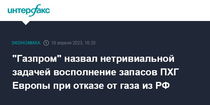 На 16 апреля 2023 года объем активного газа в ПХГ Европы составил 56,6 млрд куб. м, а на аналогичную дату 2020 года он составлял 58 млрд куб. м, то есть европейские компании уже должны восполнить на 1,4 млрд куб. м больше, чтобы достичь максимального уровня закачки сезона 2019/2020 годов - 97,6 млрд куб. м газа, посчитали в "Газпроме".