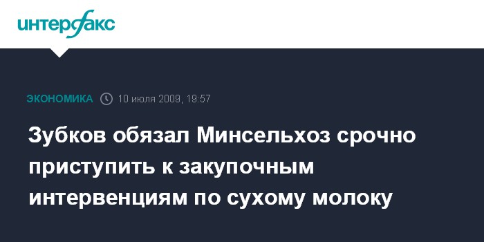 Москва. 10 июля. INTERFAX.RU - Первый вице-премьер РФ Виктор Зубков обязал Минсельхоз срочно приступить к организации закупочных интервенций на рынке сухого молока. "Сснимем лишнее молоко с рынка, чтобы не допустить падения цен, - заявил Зубков на совещании в Тюменской области, обращаясь к замминистра сельского хозяйства РФ Александру Беляеву.