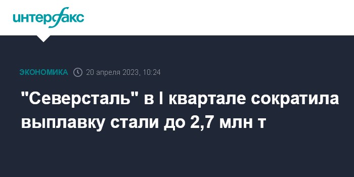 Москва. 20 апреля. INTERFAX.RU - В I квартале 2023 года "Северсталь" сократила выплавку стали на 1% по сравнению с IV кварталом 2022 года - до 2,701 млн тонн, сообщила компания. В годовом измерении выплавка упала на 8%.