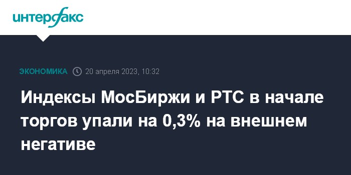 Индексы МосБиржи и РТС в начале торгов упали на 0,3% на внешнем негативе