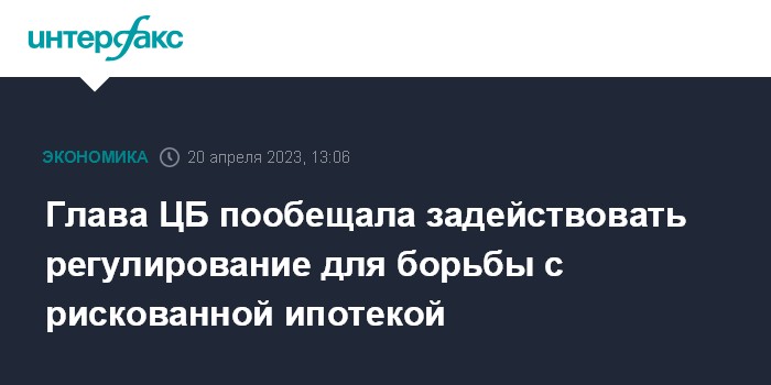 Москва. 20 апреля. INTERFAX.RU - Председатель Банка России Эльвира Набиуллина вновь заявила о недопустимости роста рискованной ипотеки, для этого ЦБ задействует регулирование.