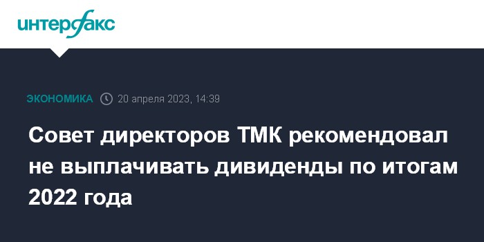 Москва. 20 апреля. INTERFAX.RU - Совет директоров ПАО "Трубная металлургическая компания" рекомендовал акционерам не выплачивать дивиденды по результатам деятельности в 2022 году, говорится в сообщении компании.