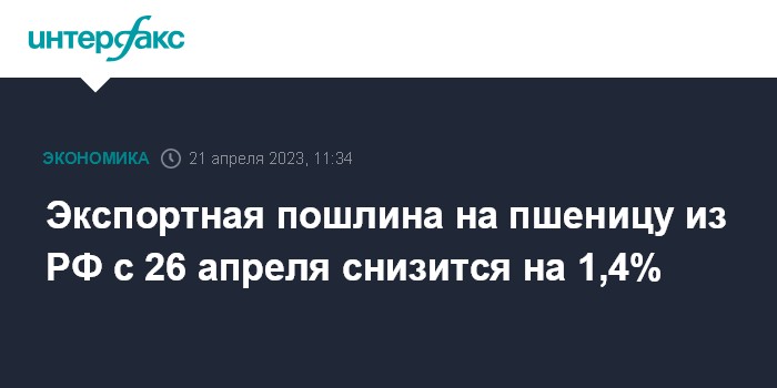 Экспортная пошлина на пшеницу из РФ с 26 апреля снизится на 1,4%