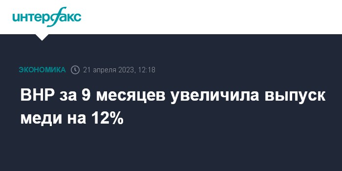 Москва. 21 апреля. INTERFAX.RU - Крупнейшая в мире горнодобывающая компания BHP за 9 месяцев 2023 финансового года (завершились 31 марта 2023 года) нарастила производство меди на 12% по сравнению с аналогичным периодом прошлого фингода, до 1,24 млн тонн, говорится в сообщении компании.