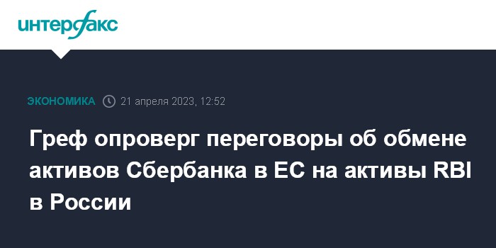 Москва. 21 апреля. INTERFAX.RU - Никаких переговоров об обмене европейских активов Сбербанка на российские активы австрийского Raiffeisen Bank International (RBI) не ведется и не велось, сообщил на пресс-конференции президент - председатель правления Сбербанка Герман Греф.