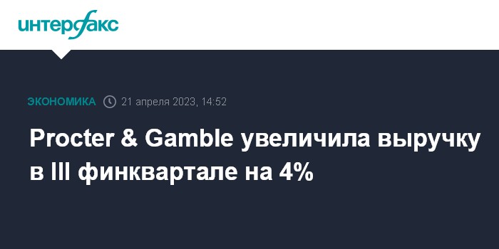 Москва. 21 апреля. INTERFAX.RU - Американская Procter & Gamble Co. (P&G), крупнейший в мире производитель потребительских товаров, увеличила чистую прибыль в третьем финансовом квартале на 1%, выручку - на 4%.
