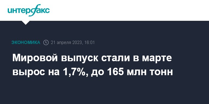 Москва. 21 апреля. INTERFAX.RU - В марте 2023 года производство стали в 63 странах мира, предоставляющих данные во Всемирную ассоциацию стали (World Steel Association), выросло на 1,7% по сравнению с аналогичным периодом 2022 года, до 165,1 млн тонн, сообщила организация.