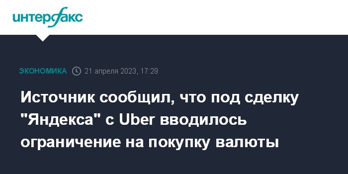 Москва. 21 апреля. INTERFAX.RU - Российские власти, выдавая "Яндексу" разрешение на выкуп у партнера по СП - Uber - остававшейся у него доли за $702,5 млн, ограничили покупку валюты для оплаты сделки на российском валютном рынке суммой $150 млн в сутки, сообщил "Интерфаксу" источник, знакомый с ситуацией.