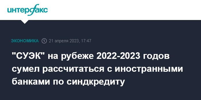 Москва. 21 апреля. INTERFAX.RU - ООО МК "СУЭК ЛТД" в декабре-январе сумело рассчитаться по синдицированному кредиту с иностранными кредиторами, следует из отчета компании.