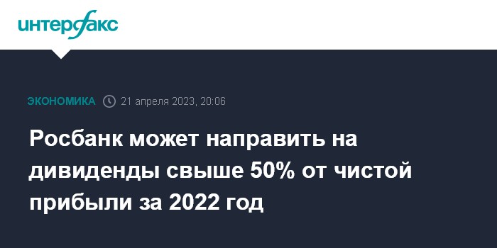 Москва. 21 апреля. INTERFAX.RU - Совет директоров Росбанка рекомендовал направить на дивиденды свыше 50% чистой прибыли по итогам 2022 года, или 4,5 млрд рублей, свидетельствуют материалы кредитной организации.