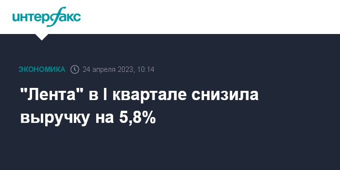 Москва. 24 апреля. INTERFAX.RU - Выручка ритейлера "Лента" в I квартале 2023 года сократилась на 5,8% по сравнению с показателем за I квартал 2022 года, до 124,6 млрд рублей, сообщила компания