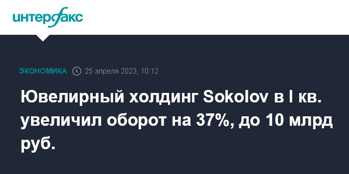 Москва. 25 апреля. INTERFAX.RU - Выручка ювелирного холдинга Sokolov по итогам первого квартала 2023 года выросла на 37% (к аналогичному периоду 2022 года) и достигла 10 млрд рублей, сообщила компания.