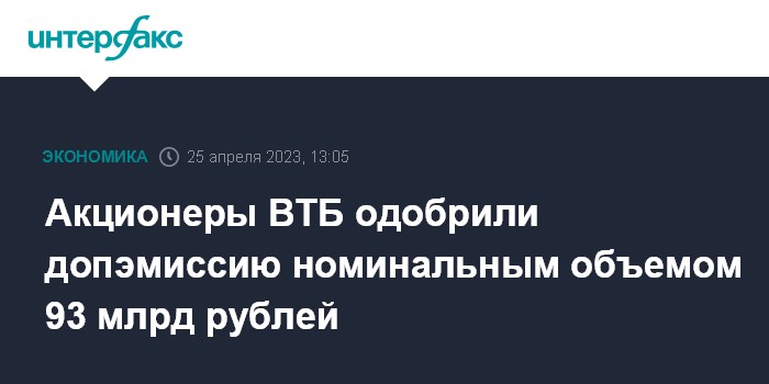 Москва. 25 апреля. INTERFAX.RU - Акционеры ВТБ одобрили размещение дополнительных обыкновенных акций номинальным объемом 93 млрд рублей, свидетельствуют материалы госбанка.