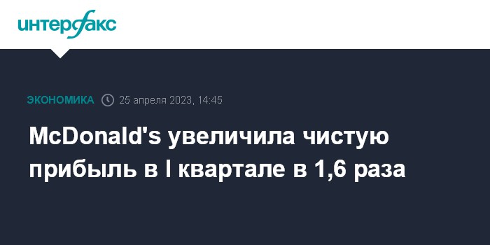 Москва. 25 апреля. INTERFAX.RU - Американская McDonald's Corp., крупнейшая в мире сеть ресторанов быстрого обслуживания, увеличила чистую прибыль в первом квартале 2023 года в 1,6 раза, выручку – на 4,1%.