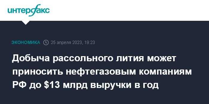 Москва. 25 апреля. INTERFAX.RU - Отечественные нефтекомпании в перспективе могут стать крупными производителями лития благодаря его получению из рассолов на ранее пробуренных нефтегазовых скважинах; потенциальный объем дополнительной выручки к 2040 году может составить до $13 млрд ежегодно.
