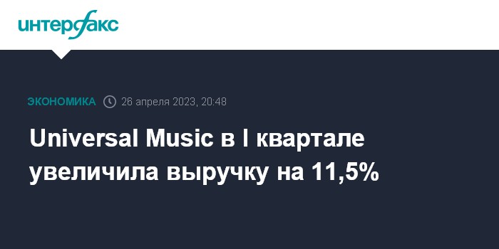 Москва. 26 апреля. INTERFAX.RU - Universal Music Group NV (UMG), крупнейшая звукозаписывающая компания мира, в первом квартале увеличила выручку на 11,5% - до 2,451 млрд евро по сравнению с 2,199 млрд евро за аналогичный период прошлого года.