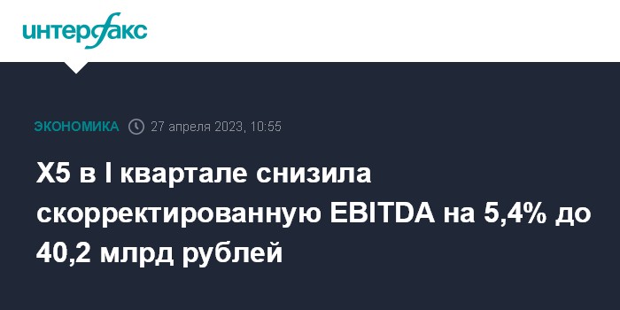 Москва. 27 апреля. INTERFAX.RU - Скорректированная EBITDA X5 Retail Group в I квартале 2023 года снизилась на 5,4% – до 40,24 млрд рублей, говорится в сообщении компании.