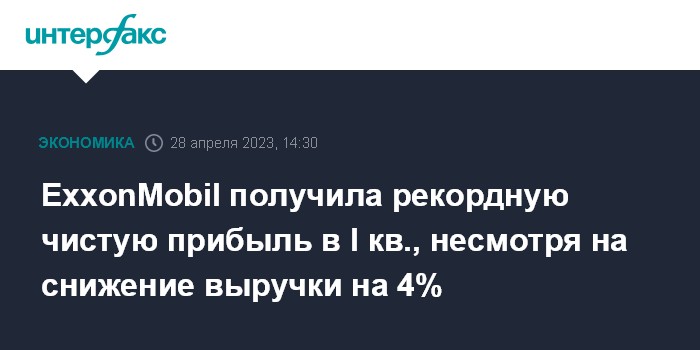 Москва. 28 апреля. INTERFAX.RU - Крупнейшая нефтегазовая компания США ExxonMobil Corp. увеличила чистую прибыль в первом квартале 2023 года более чем вдвое - до рекордного уровня, несмотря на 4%-е снижение выручки.