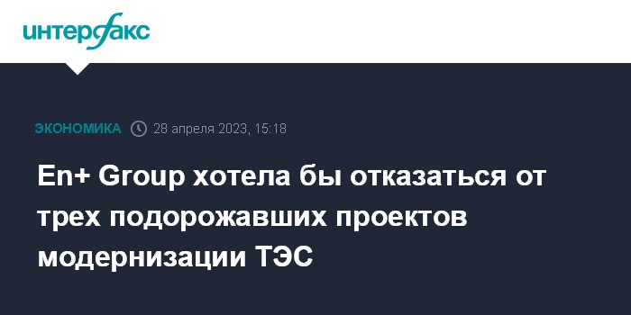 Москва. 28 апреля. INTERFAX.RU - En+ Group хотела бы без штрафов отказаться от трех из 12 своих проектов модернизации ТЭС, заявил журналистам руководитель энергетического бизнеса компании Михаил Хардиков.