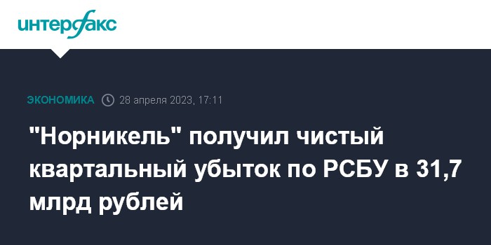 Москва. 28 апреля. INTERFAX.RU - В I квартале 2023 года "Норникель "получил чистый убыток по РСБУ 31,66 млрд рублей против прибыли в 13,87 млрд рублей годом ранее, следует из отчетности ГМК.