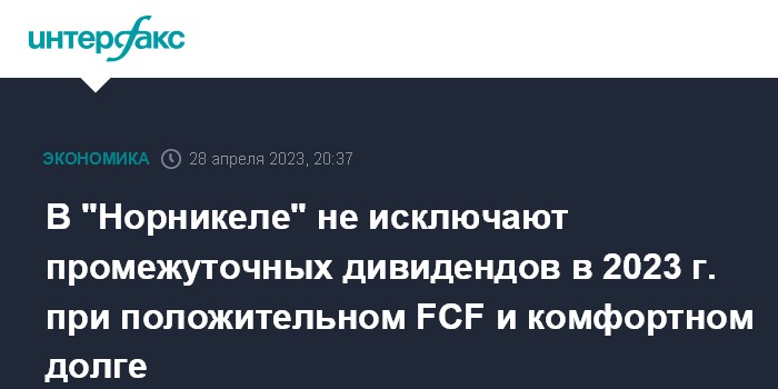 Москва. 28 апреля. INTERFAX.RU - Топ-менеджмент "Норникеля", совет директоров которого рекомендовал отказаться от дивидендов за 2022 год, не исключает выплаты промежуточных дивидендов в 2023 году, в случае если компания получит положительный FCF и сохранит долг на комфортном уровне.