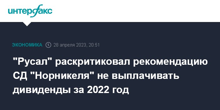 "Русал" раскритиковал рекомендацию СД "Норникеля" не выплачивать дивиденды за 2022 год