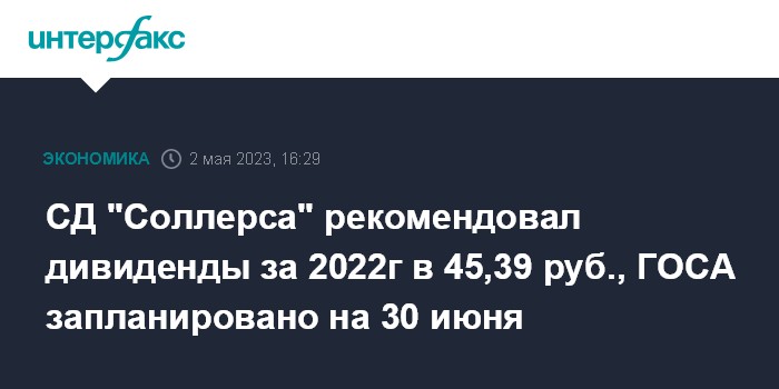 СД "Соллерса" рекомендовал дивиденды за 2022г в 45,39 руб., ГОСА запланировано на 30 июня