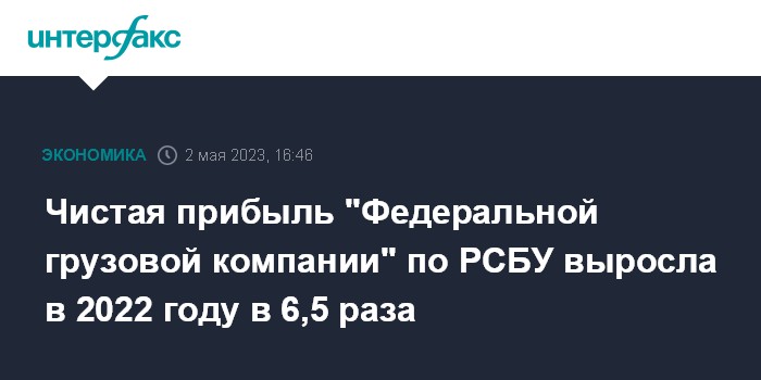 Москва. 2 мая. INTERFAX.RU - Чистая прибыль АО "Федеральная грузовая компания" (ФГК) по РСБУ выросла в 2022 году в 6,5 раза, до 41,3 млрд руб. с 6,4 млрд руб. за 2021 г., сказано в отчетности компании.