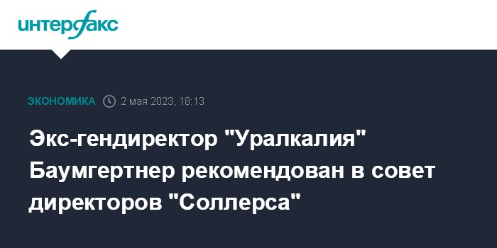 Москва. 2 мая. INTERFAX.RU - Бывший гендиректор "Уралкалия" (2005-2010 годы) и стивидора Global Ports (2015-2017 годы) Владислав Баумгертнер рекомендован кандидатом в совет директоров ПАО "Соллерс", следует из сообщения автопроизводителя.