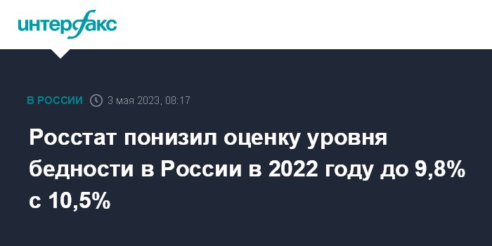Москва. 3 мая. INTERFAX.RU - Росстат понизил оценку уровня бедности в стране в 2022 году до 9,8% с предварительной оценки в 10,5% (была опубликована в марте). Уточненная оценка приводится на сайте статслужбы.