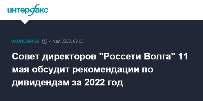 Совет директоров "Россети Волга" 11 мая обсудит рекомендации по дивидендам за 2022 год