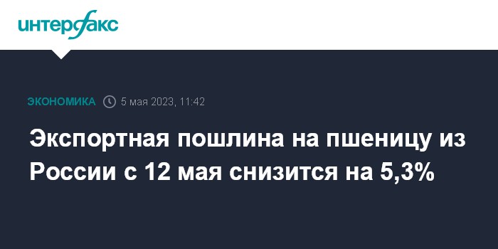 Экспортная пошлина на пшеницу из России с 12 мая снизится на 5,3%