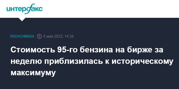 Москва. 5 мая. INTERFAX.RU - Биржевые цены на Аи-95 на уходящей неделе продолжили расти и вплотную приблизились к историческому максимуму, свидетельствуют данные Санкт-Петербургской международной товарно-сырьевой биржи (СПбМТСБ).