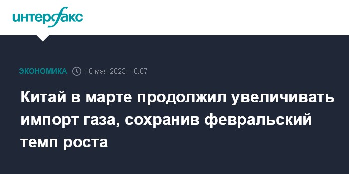 Москва. 10 мая. INTERFAX.RU - Китай в марте продолжил увеличивать импорт газа (речь идет как о поставках по трубопроводам, так и в виде СПГ) - в марте рост был на том же уровне, что и в феврале.