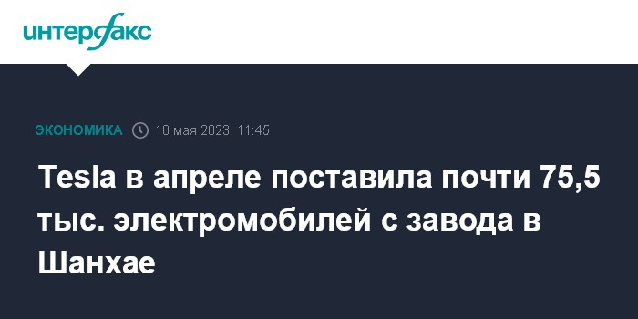 Москва. 10 мая. INTERFAX.RU - Американская Tesla в апреле поставила с шанхайского завода 75 482 электромобиля, свидетельствуют данные Китайской ассоциации пассажирских автомобилей (CPCA).