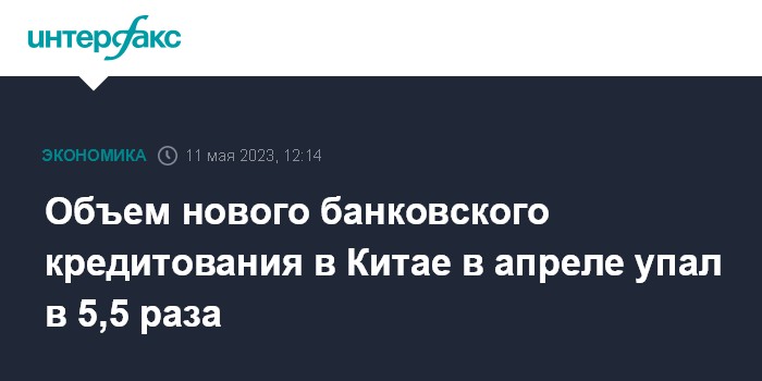 Москва. 11 мая. INTERFAX.RU - Объем нового банковского кредитования в национальной валюте в Китае в апреле упал до 718,8 млрд юаней ($103,7 млрд) по сравнению с 3,89 трлн юаней месяцем ранее, свидетельствуют данные Народного банка Китая (НБК).