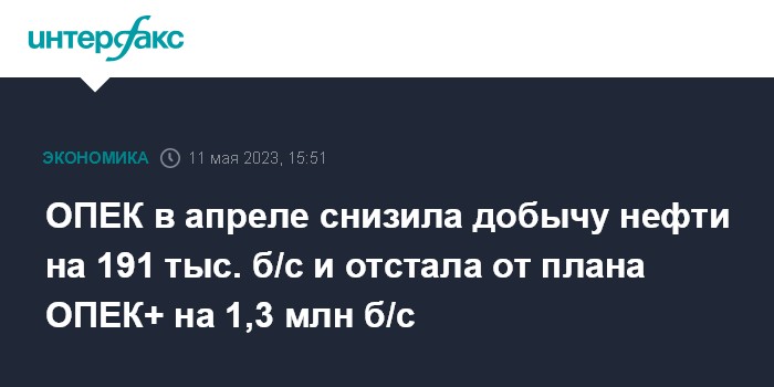 ОПЕК в апреле снизила добычу нефти на 191 тыс. б/с и отстала от плана ОПЕК+ на 1,3 млн б/с