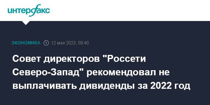 Москва. 12 мая. INTERFAX.RU - Совет директоров ПАО "Россети Северо-Запад" рекомендовал не выплачивать дивиденды по итогам 2022 года, говорится в материалах компании.